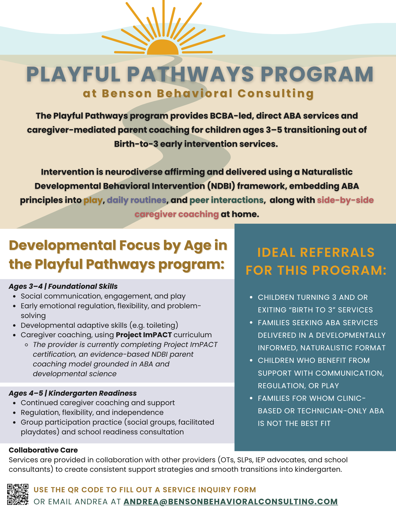 Support can be provided to families through parent coaching sessions. During these sessions, goals are created as well as parent education related to specific evidence-based ABA strategies to use for your family and child based on their needs. Customized resources will be created for your family to use to help with challenging behaviors, daily routines, transitions, and independence skills.